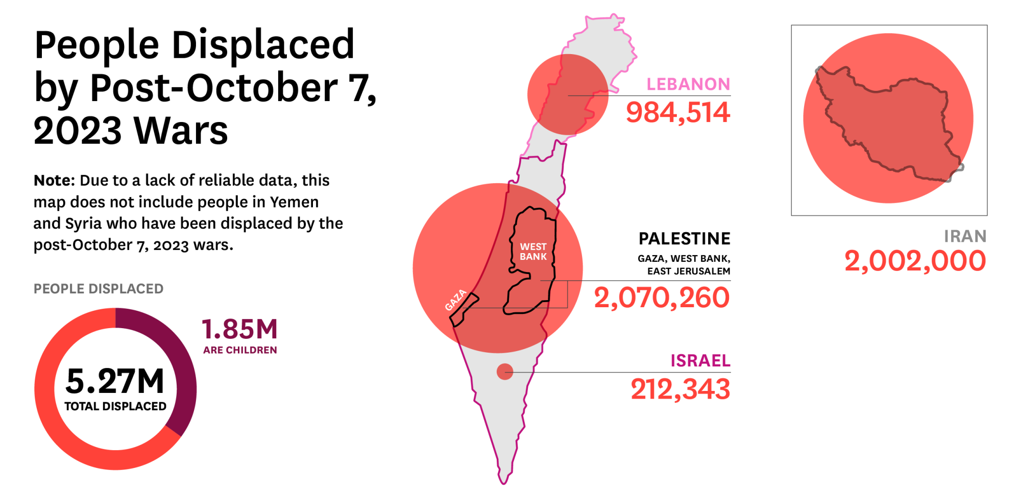 Some of these people have since returned home, while many others have not. (This figure does not include Syria and Yemen, where still more people have been displaced, but there is a lack of data documenting how the post-10/7 wars have caused displacement.)