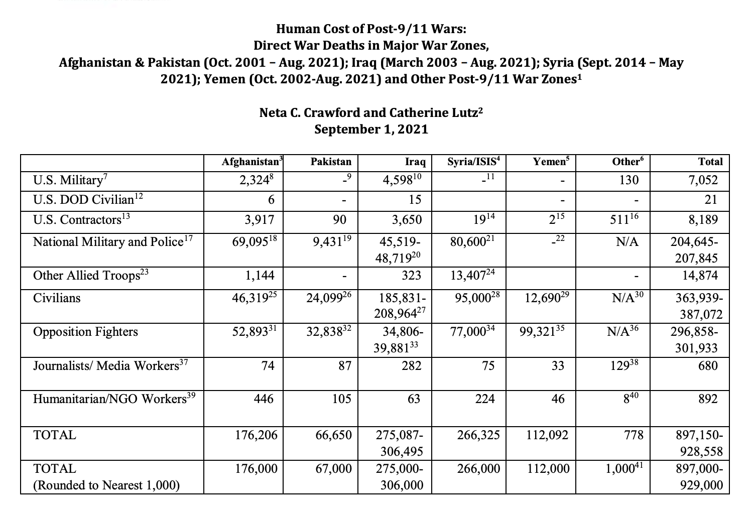 This chart, compiled by political scientist Neta Crawford (Co-Founder, Costs of War and Professor, Oxford University) and anthropologist Catherine Lutz (Co-Founder, Costs of War), tallies reported deaths caused by direct war violence in the post-9/11 wars. It does not include indirect deaths, namely those caused by loss of access to food, water, and/or infrastructure, war-related disease, etc. The numbers included here are approximations based on the reporting of several original data sources.